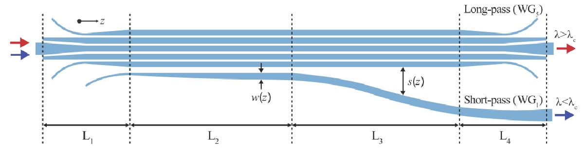We’ve developed a method to create highly efficient, compact “single-cutoff” filters that cleanly split light into short-pass and long-pass transmission outputs. The magic happens when we cascade two of these filters. By independently tuning the cutoff point of each stage (simply by adjusting waveguide geometry!), we can precisely define the edges of a band-pass filter.