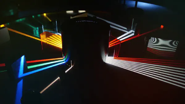 Pictured is a 3D-render of scattered light from the integrated waveguides comprising the filter, captured at two different wavelengths directed towards the two separate output ports of the filter.